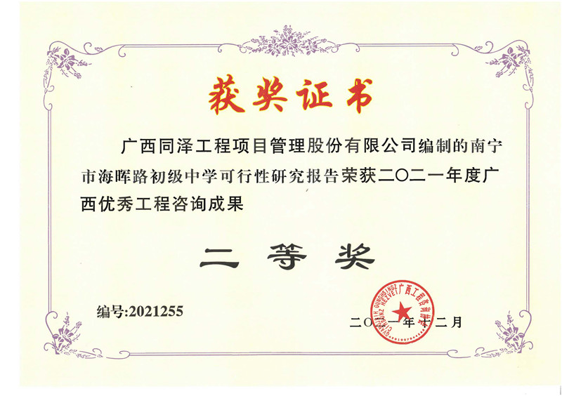 南寧市海暉路初級中學可行性研究報告榮獲2021年度廣西優(yōu)秀工程咨詢成果二等獎