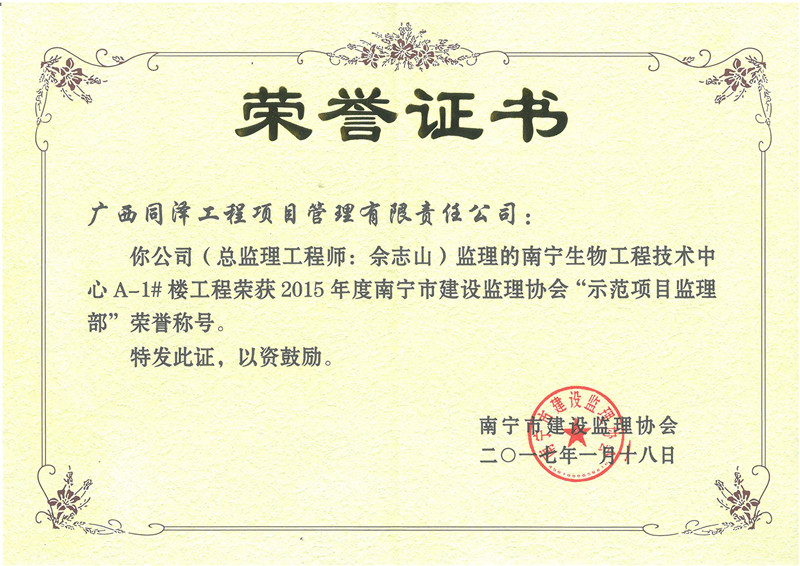 南寧生物工程技術(shù)中心A-1#樓項目榮獲2015年度“示范項目監(jiān)理部”榮譽稱號